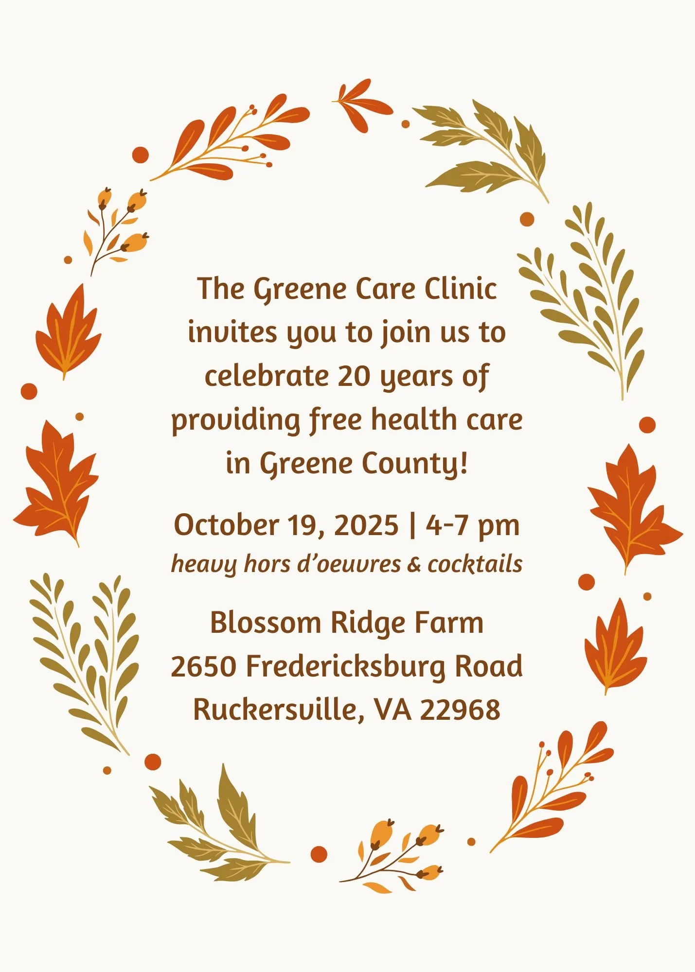 Please join us to celebrate 20 years of providing free health care to uninsured adults in Greene County! Tickets for our celebratory fundraiser are $100 per person and can be purchased below. The event will take place at Blossom Ridge Farm on Sunday, October 19, from 4 pm - 7 pm.